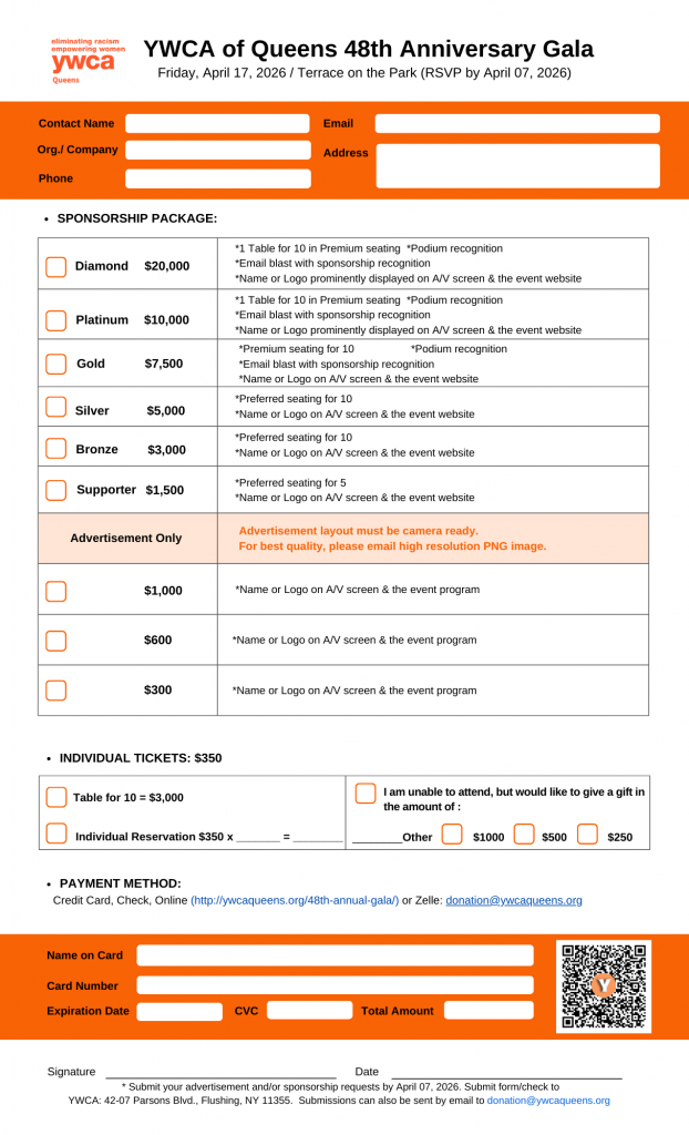 Come celebrate YWCA of Queens 48th Anniversary Gala. The gala will be held on Friday, April 17, 2026 at 6:30pm. Please save the date and we look forward to celebrating with you!