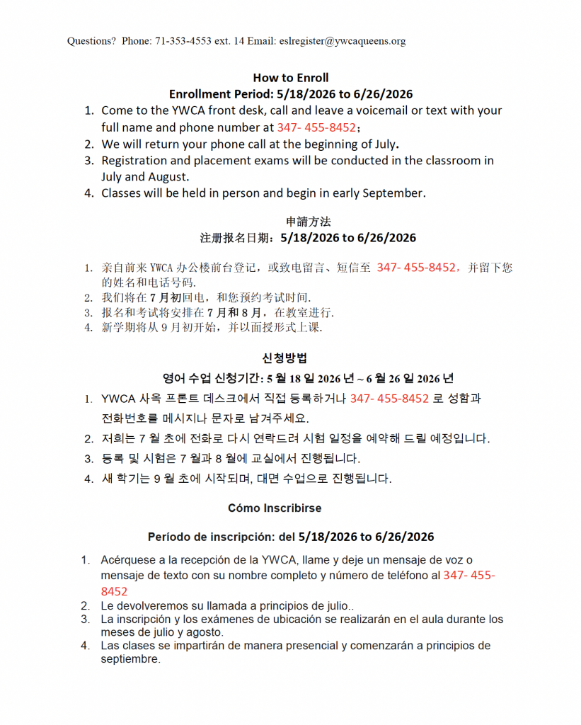 Call 718-353-4553 ext. 14 or email eslregister@ywcaqueens.org, for more information and other questions about enrollment.
